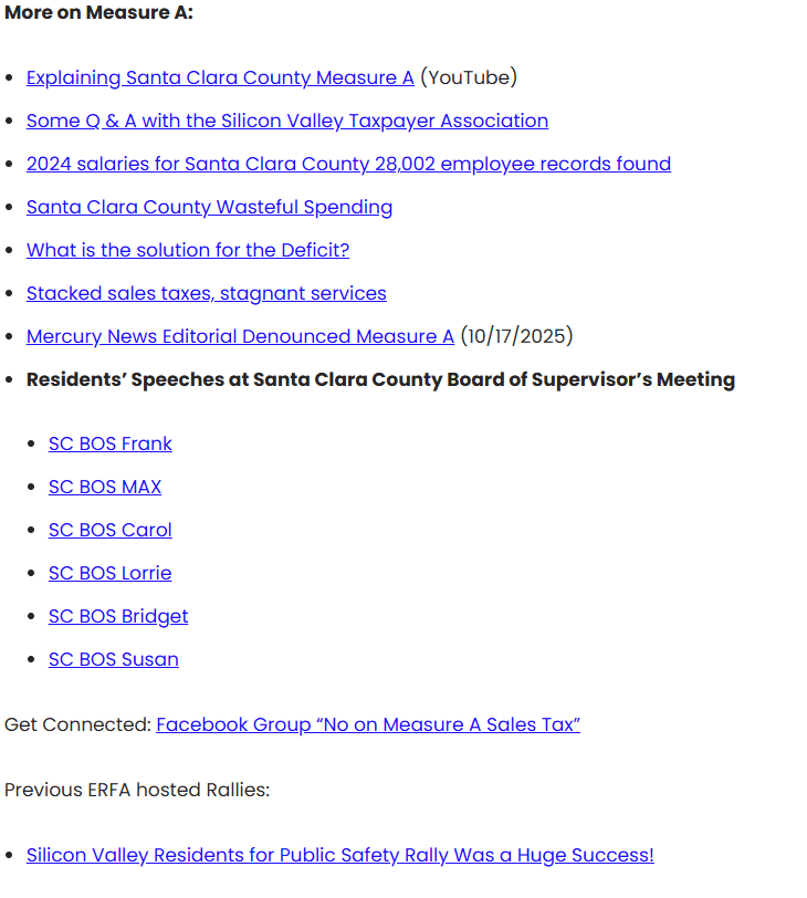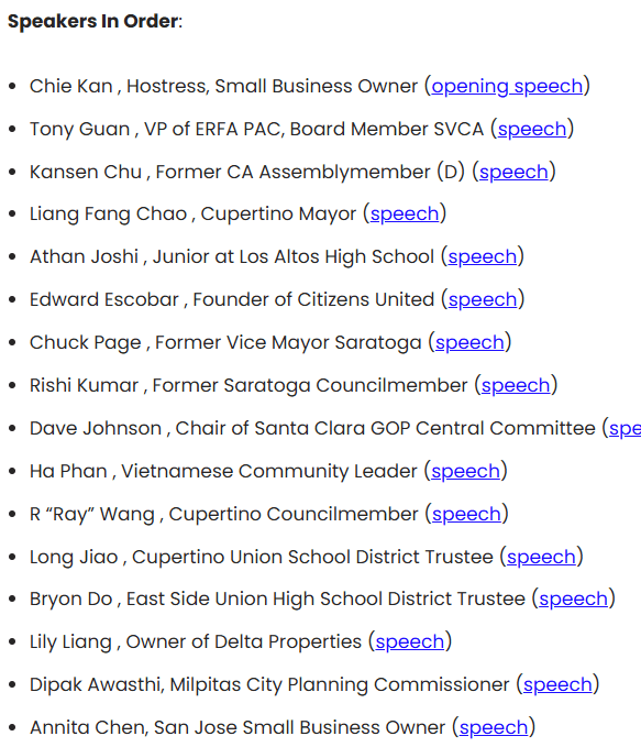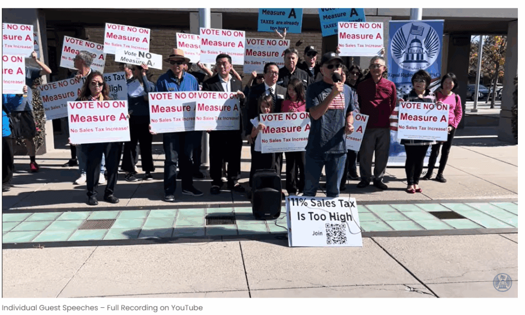 Respected elected officials such as Kansen Chu (Former Assemblymember D), Liang Fang Chao (Independent), Rishi Kumar (Former Saratoga Counciilmember, Democratic Party Central committee voting member) (all of them are on the opposition list against Measure A in the voter guide) and more gave powerful speeches on why they are against this sales tax increase Measure A for Santa Clara County.