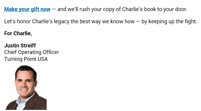 All we ask is that you chip in ANY amount to help Turning Point USA continue the mission Charlie started — reaching the next generation with truth, boldness, and love for America.
