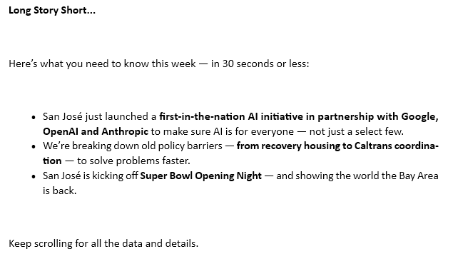 We’re also upskilling our City Hall workforce. In less than a year, our first two cohorts of AI-trained city workers have saved between 10,000 and 20,000 staff hours and $50,000 in consulting costs. Given these early successes, we’re expanding to achieve a goal of training more than 1,000 employees — 15% of our workforce — by the end of 2026. We’re one of the first major cities to roll out AI training at this scale (thanks to SJSU for helping develop the curriculum), and we hope our approach serves as a model for others.