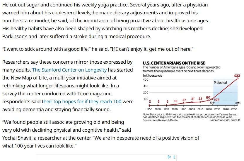 The cash crunch is real. On average, assisted living can cost $6,694 a month, about twice the average monthly rent in the Bay Area. The Pew study found a direct link between financial security and health outcomes. Only 26% of low-income seniors reported being in very good or excellent health, compared to 49% of those with the highest incomes. This changes the picture of living to 100: More than four in 10 adults are not confident they have enough cash to cover their retirement years.